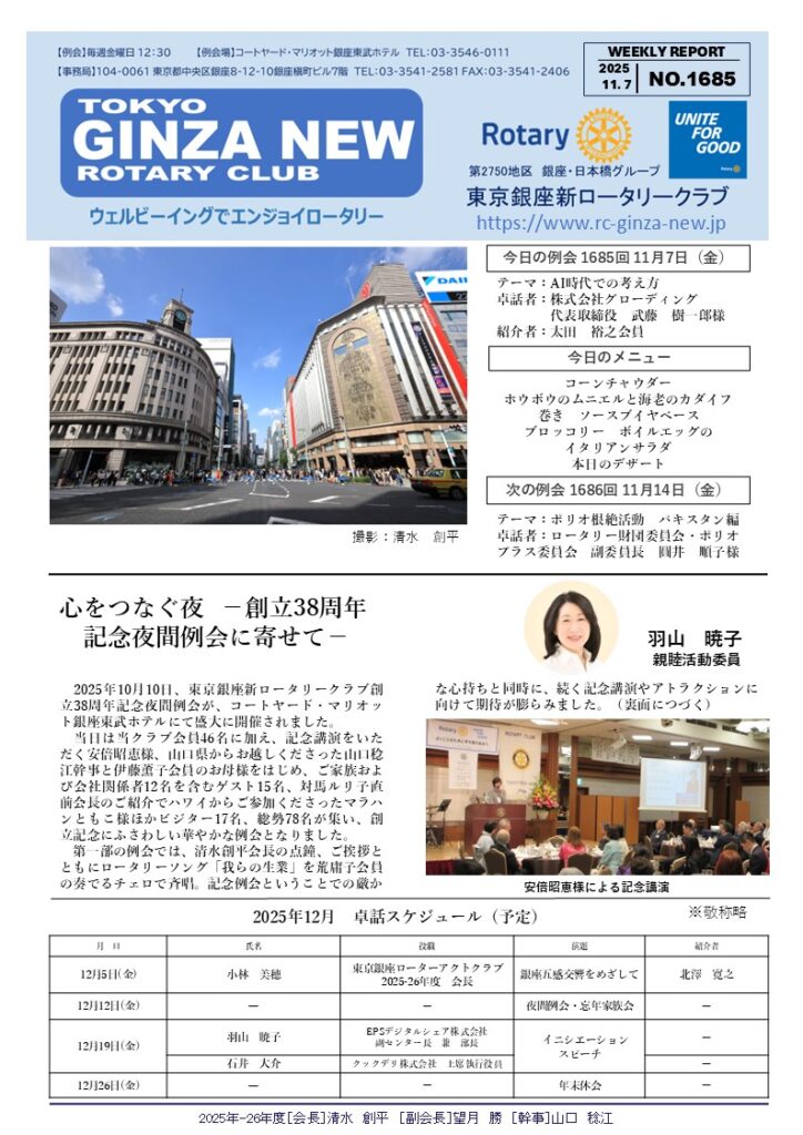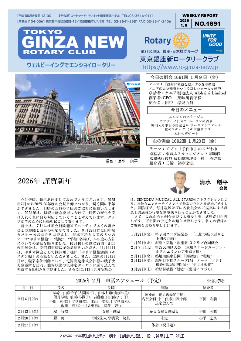 2019年10月25日 / 最終更新日時 : 2019年10月31日 ginzanew-itweb 活動報告 ガバナー公式訪問(2019年10月25日) 10月25日(金)、当クラブの第1480回例会は 2019-2020年年度RI2750地区 淺田豊久ガバナーの公式訪問であり、東京銀座ロータリークラブ、東京築地ロータリークラブ、東京銀座新ロータリークラブの3クラブ合同例 […]